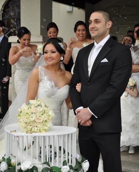 The wedding day was beautiful.. I have attached a photo of Marc and I from the day.. It didn’t rain.. Luckily! It was windy though.. My veil was flying around everywhere and it ripped during photos in the city.. But it’s okay! Hope u are well 🙂